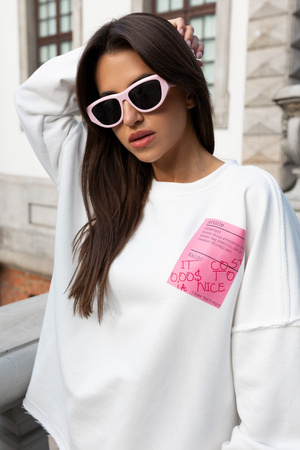 Bluza dresowa - oversize z sitem w formie paragonu - Biała z Różowym