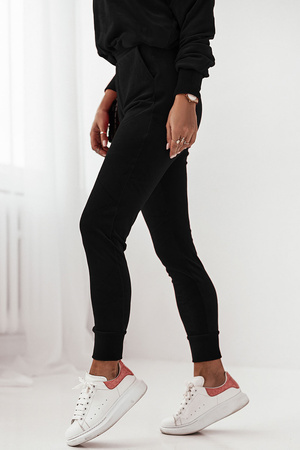 Do tego spodnie typu slim z wysoką talią oraz bocznymi kieszeniami, a dla komfortu noszenia - w pasie elastyczna szeroka guma. U dołu nogawek wysokie ściągacze.